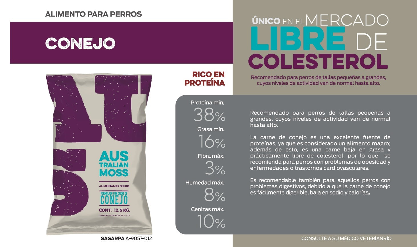 La carne de conejo es una excelente fuente de proteínas, ya que es considerado un alimento magro; además de esto, es una carne baja en grasa y prácticamente libre de colesterol, por lo que se recomienda para perros con problema de obesidad y enfermedades o trastornos cardiovasculares.