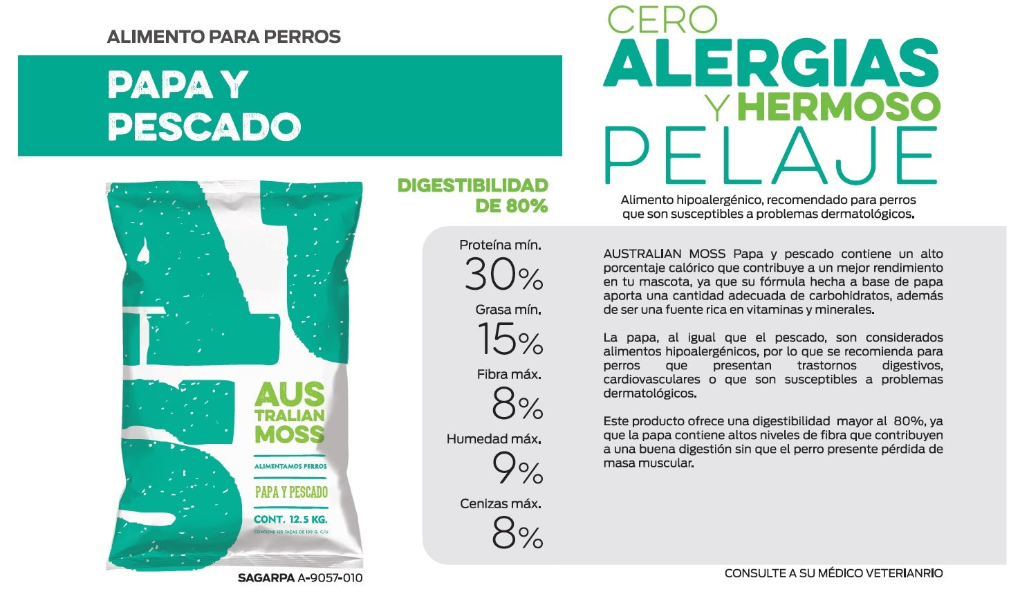 Australian Moss Papa y Pescado contiene un alto porcentaje calórico que contribuye a un mejor rendimiento en tu mascota, ya que su fórmula hecha base de papa aporta una cantidad adecuada de carbohidratos, ademas de ser una fuente rica en vitaminas y minerales.