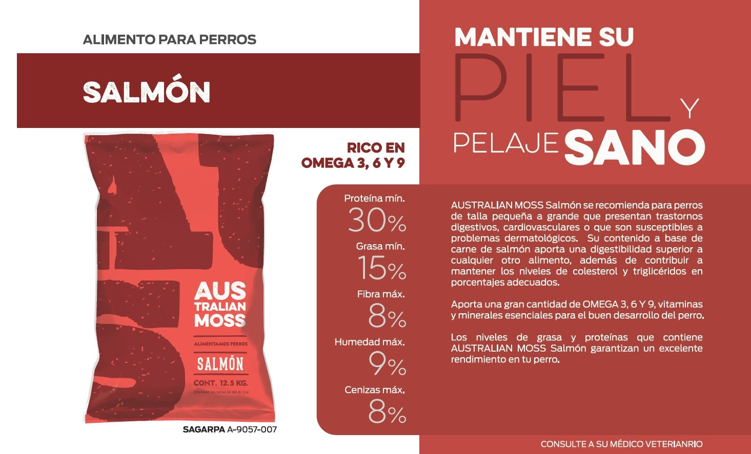 Australian Moss Salmón se recomienda para perros de talla pequeña a grande que presentan trastornos digestivos, cardiovasculares o que son susceptibles a problemas dermatológicos. Su contenido a base de carne de salmón aporta una digestibilidad superior a cualquier otro alimento, además de contribuir a mantener los niveles de colesterol y triglicéridos en porcentajes adecuados.
