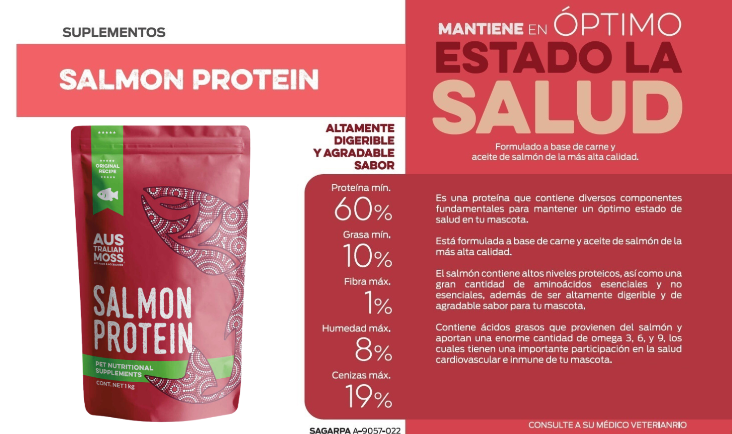Contiene ácidos grasos que provienen del salmón y aporta una enorme cantidad de omega 3, 6 y 9 los cuales tienen una importante participación en la salud cardiovascular e inmune de tu mascota.